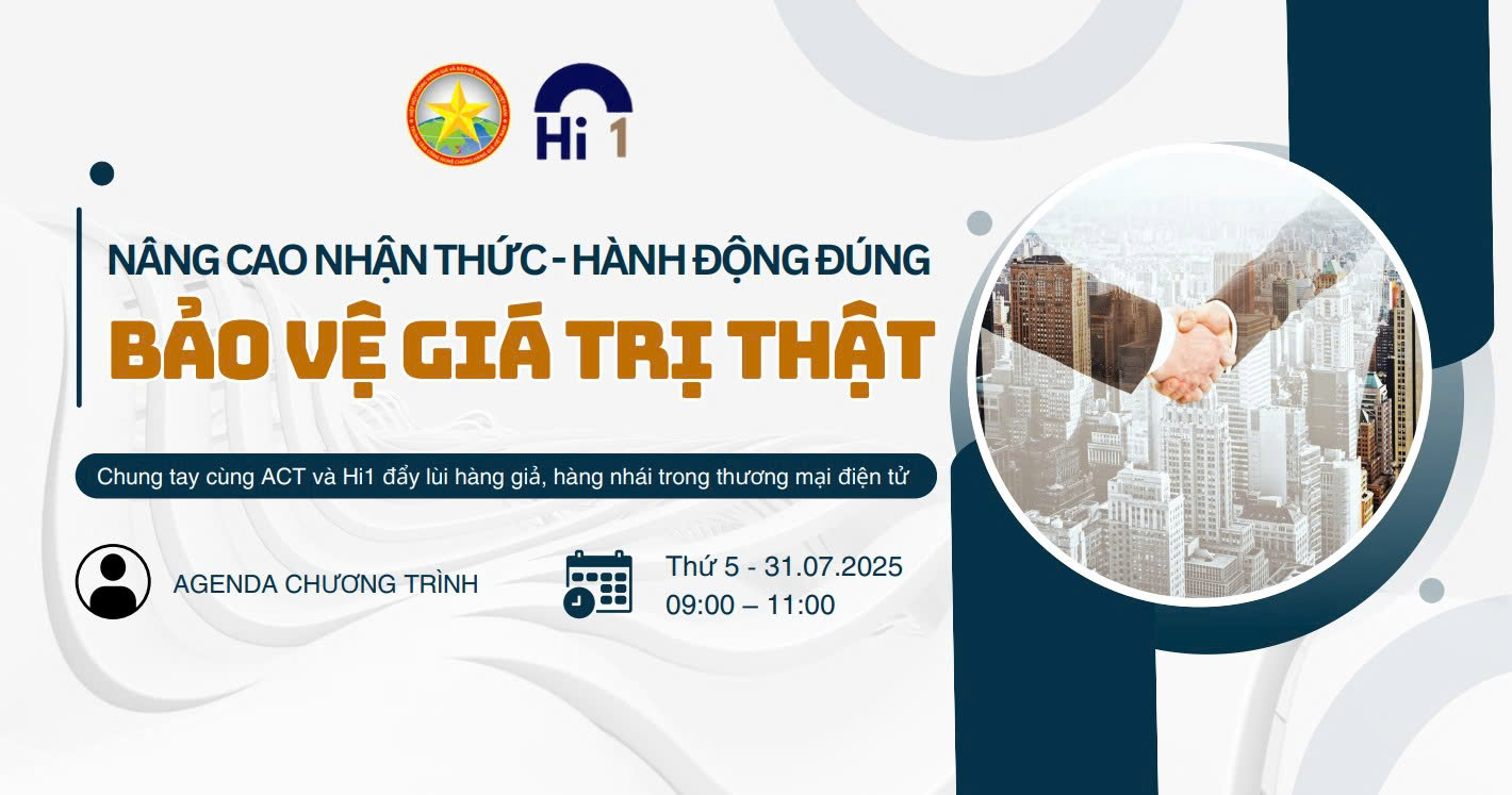 Thứ năm, ngày 31/7/2025 tại Trung tâm Công nghệ Chống hàng giả Việt Nam (ACT) địa chỉ số 53 Nguyễn Du, phường Nguyễn Du, thành phố Hà Nội sẽ diễn ra buổi Workshop với chủ đề: " Bảo vệ giá trị thật " được Trung tâm ACT phối hợp cùng Sàn Thương Mại điện tử Hi1 tổ chức chương trình truyền thông nhằm nâng cao nhận thức cộng đồng về vấn nạn hàng giả, hàng nhái trên các sàn thương mại điện tử và cùng nhau hành động thiết thực để bảo vệ người tiêu dùng, bảo vệ thương hiệu thật.