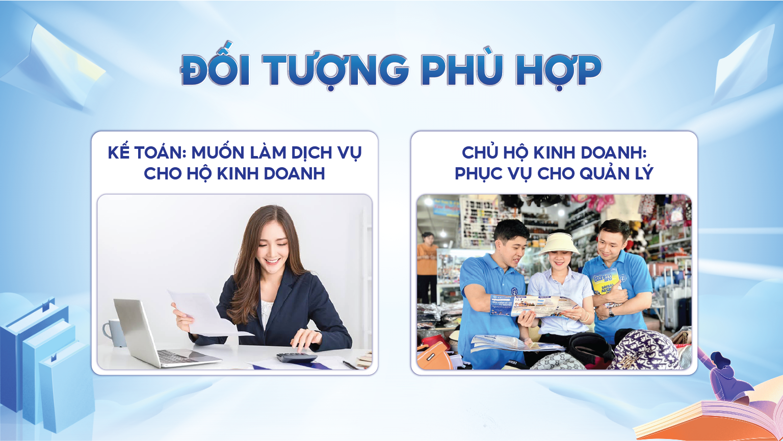 - Nhân sự kế toán muốn nâng cao kỹ năng thực tế và tạo thêm thu nhập từ dịch vụ tư vấn - hỗ trợ hộ kinh doanh.