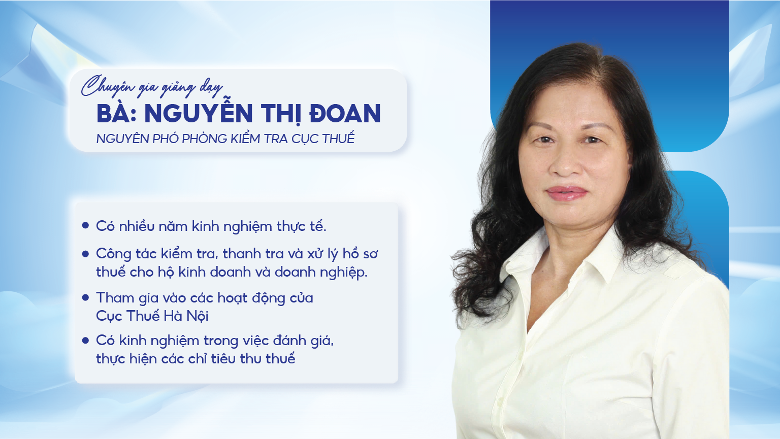 Chương trình được trực tiếp hướng dẫn bởi bà Nguyễn Thị Đoan – Nguyên Phó phòng Kiểm tra Cục Thuế, người có nhiều năm kinh nghiệm thực tế trong công tác kiểm tra, thanh tra và xử lý hồ sơ thuế cho hộ kinh doanh và doanh nghiệp.