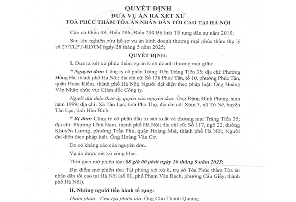 Tòa phúc thẩm TAND tối cao tại Hà Nội ra quyết định ngày 10/9 tới sẽ xét xử phúc thẩm vụ án kinh doanh thương mại giữ nguyên đơn là Công ty CP Tràng Tiền Tràng Tiền 35 và bị đơn là Công ty CP Đầu tư Sản xuất và Thương mại Tràng Tiền 35.